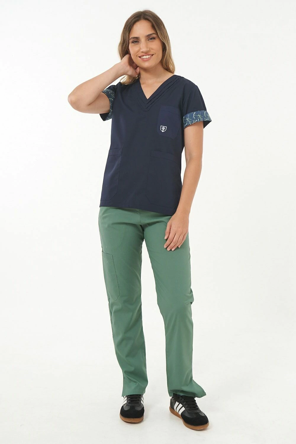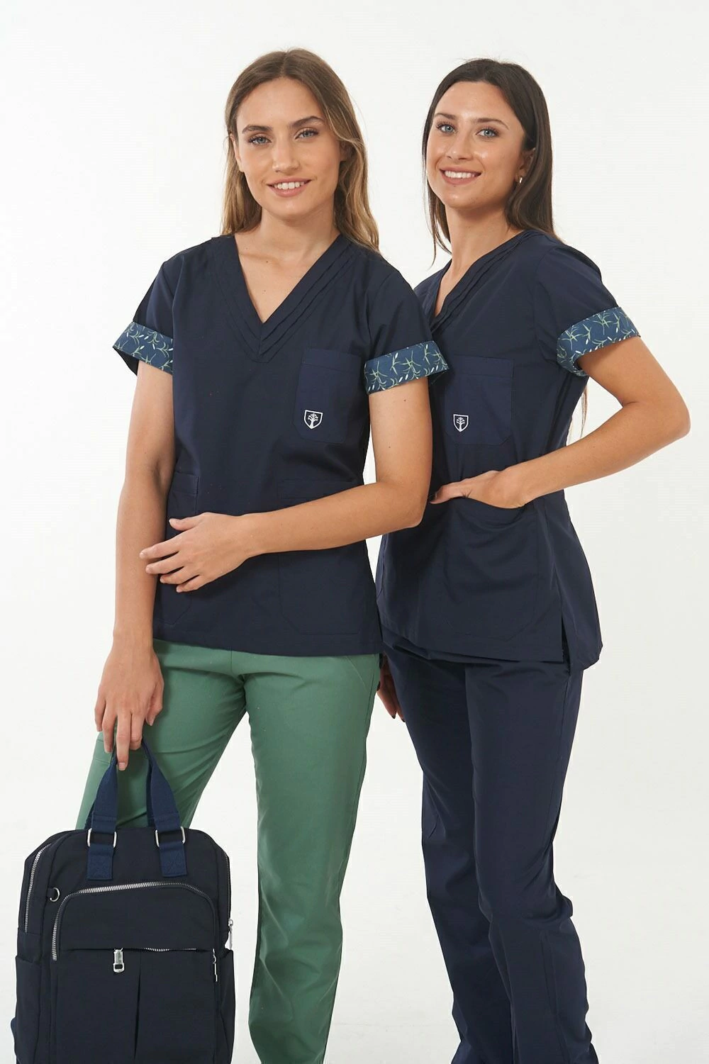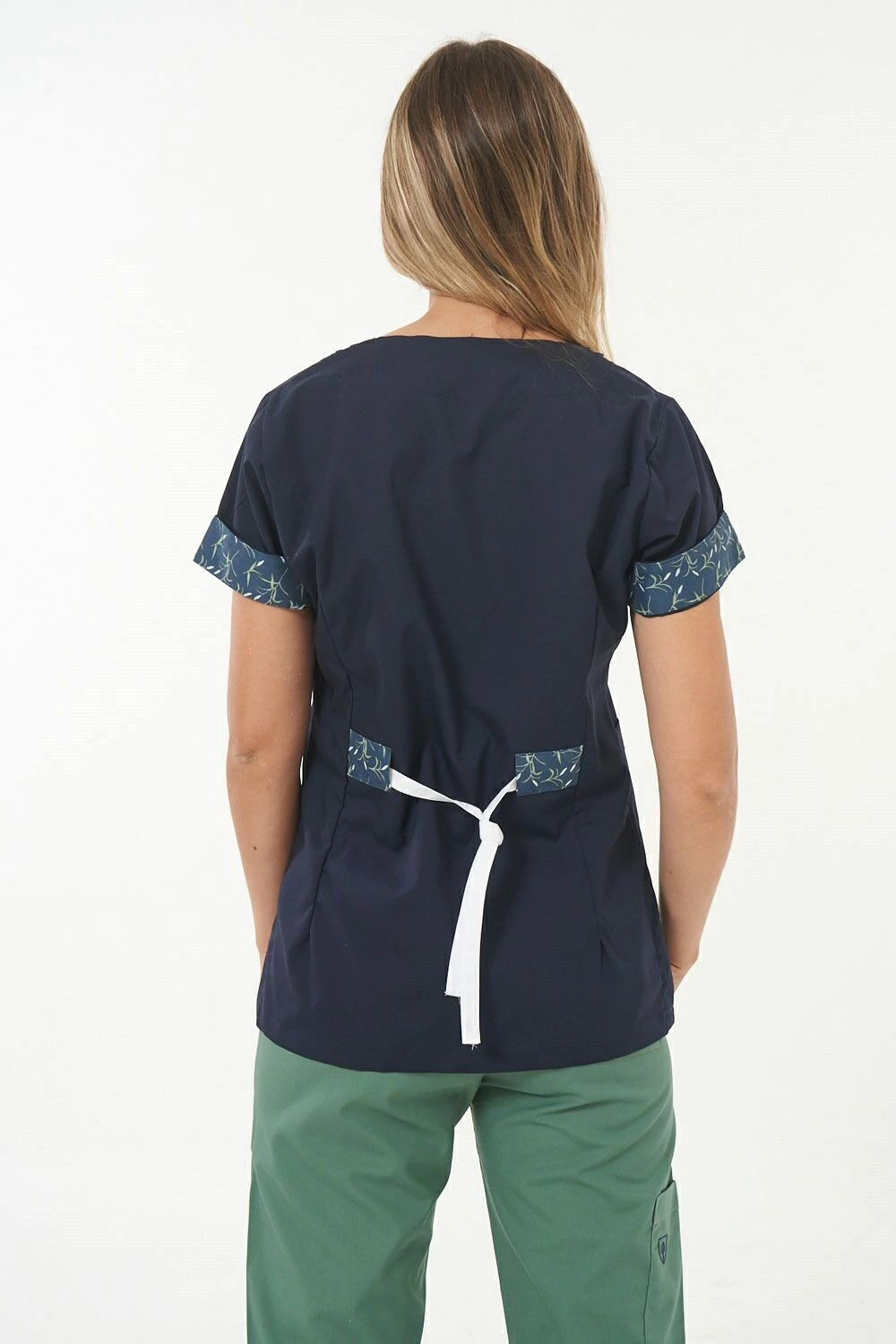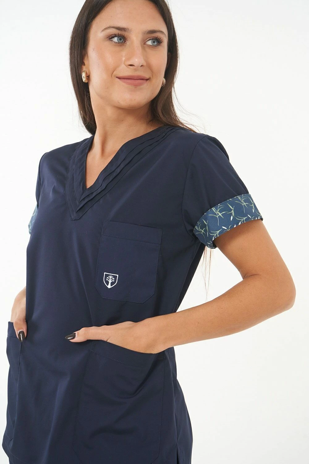 Tela de combinacion estampada en mangas y presillas. en algunos colores se suma un vivo de color contrastante en las mangas.