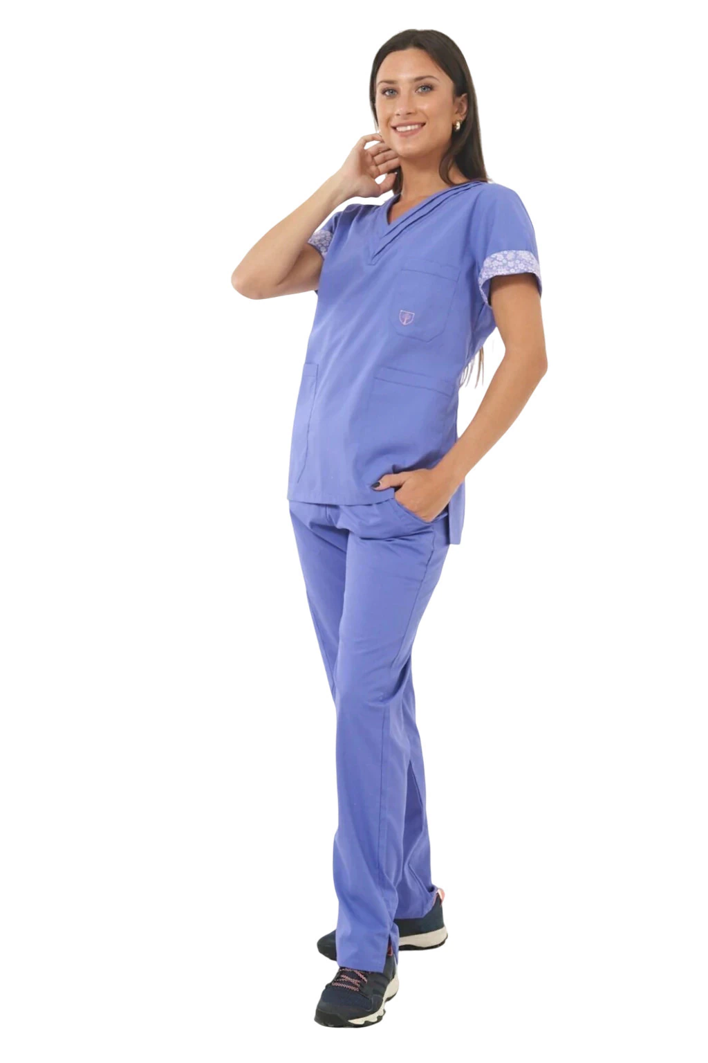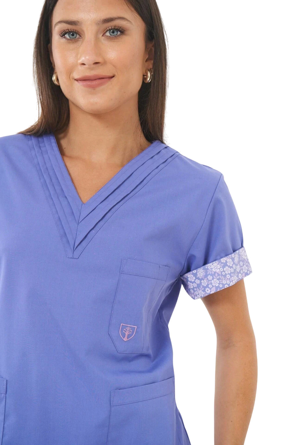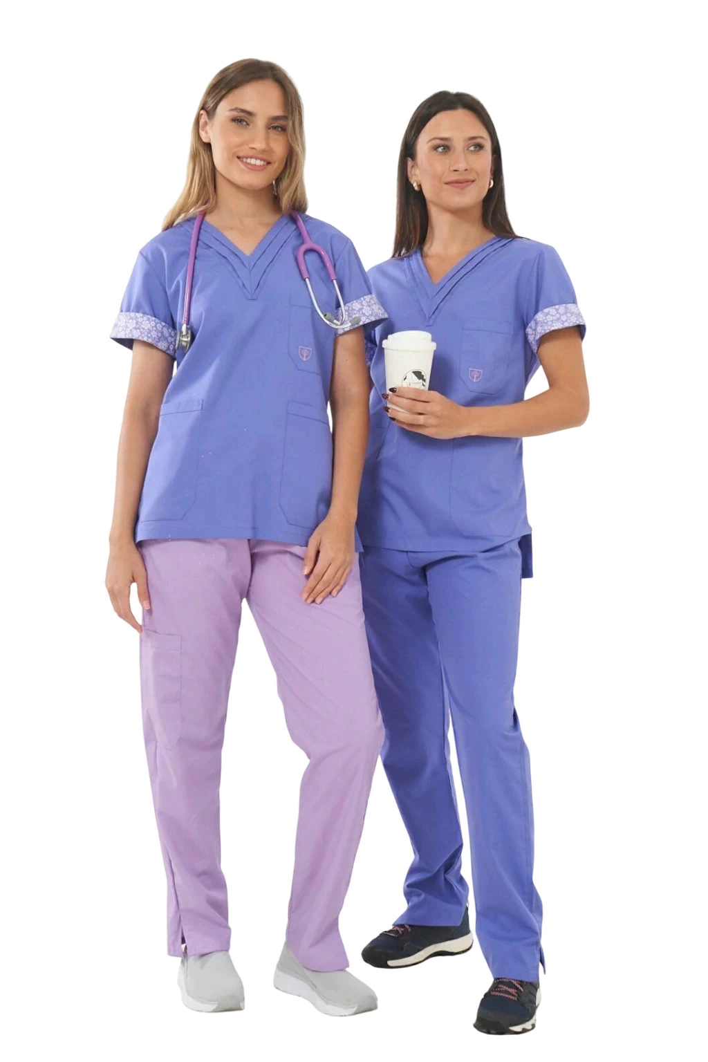 Tela de combinacion estampada en mangas y presillas. en algunos colores se suma un vivo de color contrastante en las mangas.