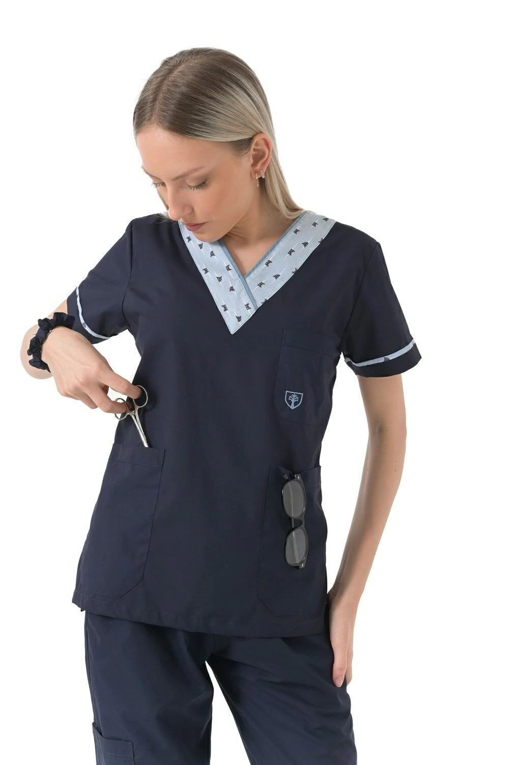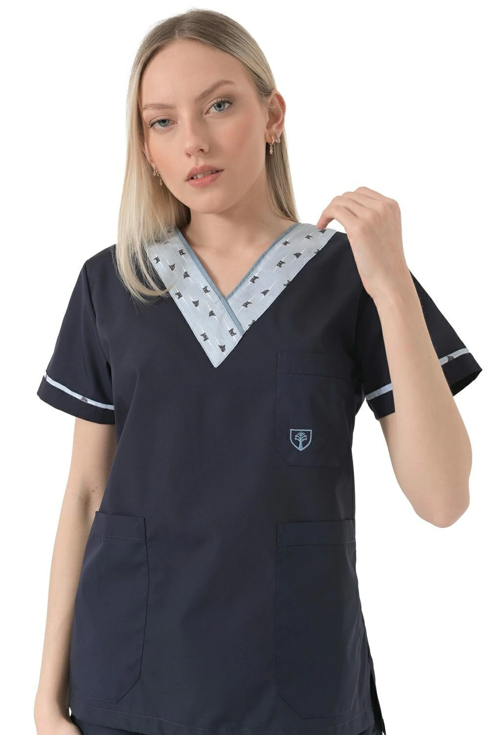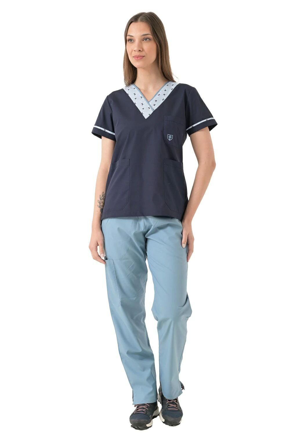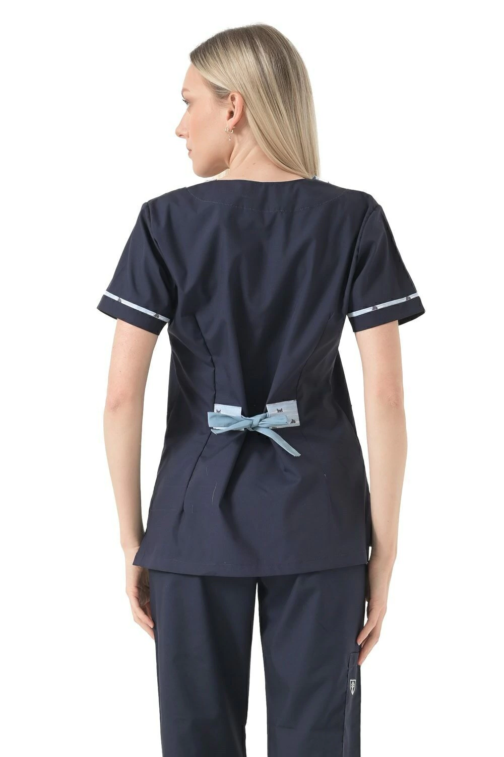 Espalda: tela de combinación con elástico y 2 tiras en tela lisa a manera de eslabón, para marcar la cintura.