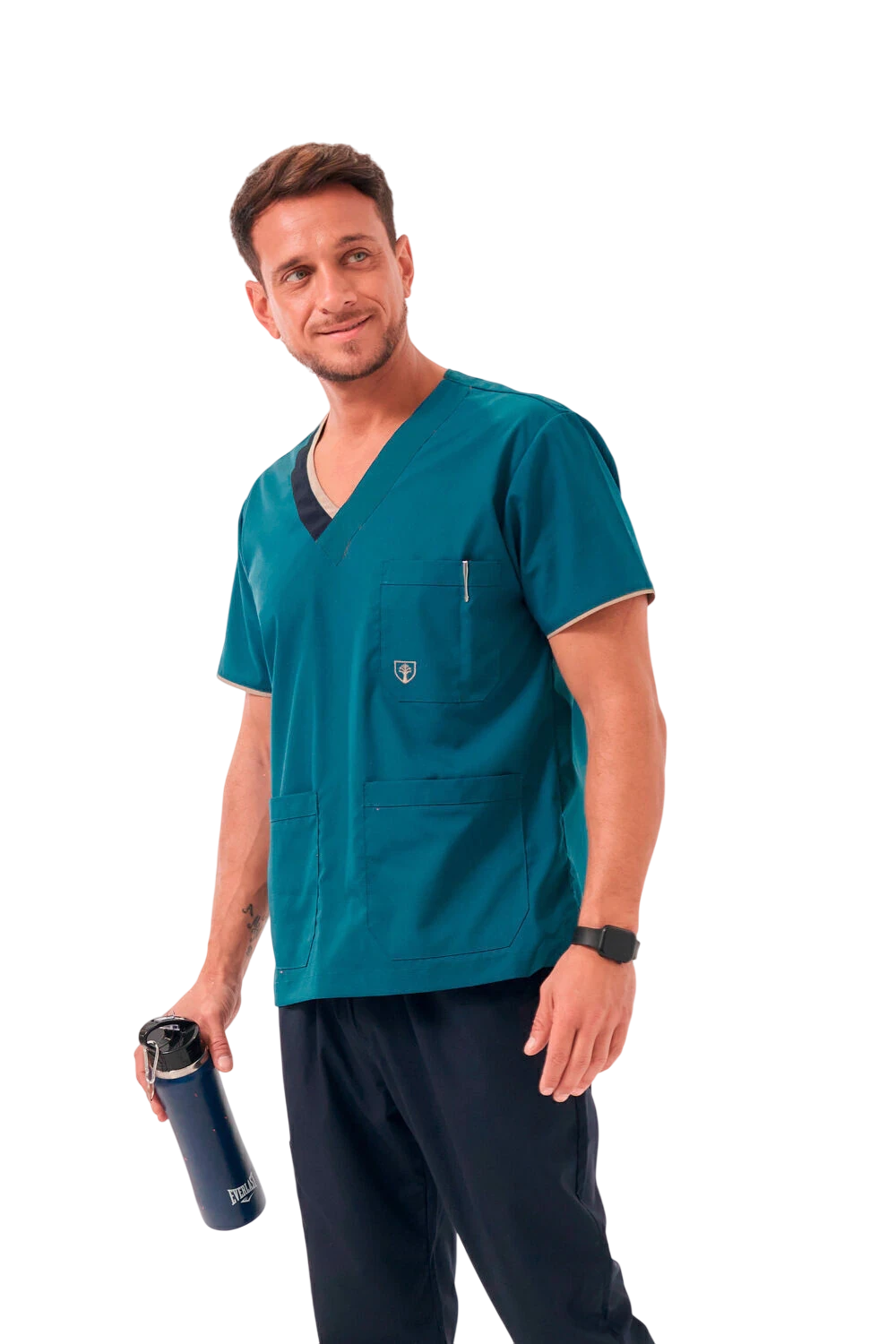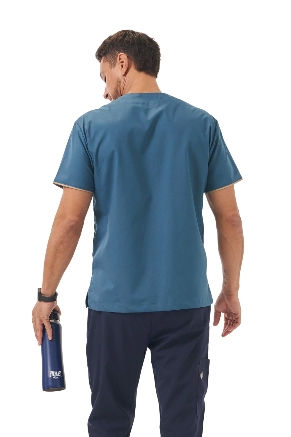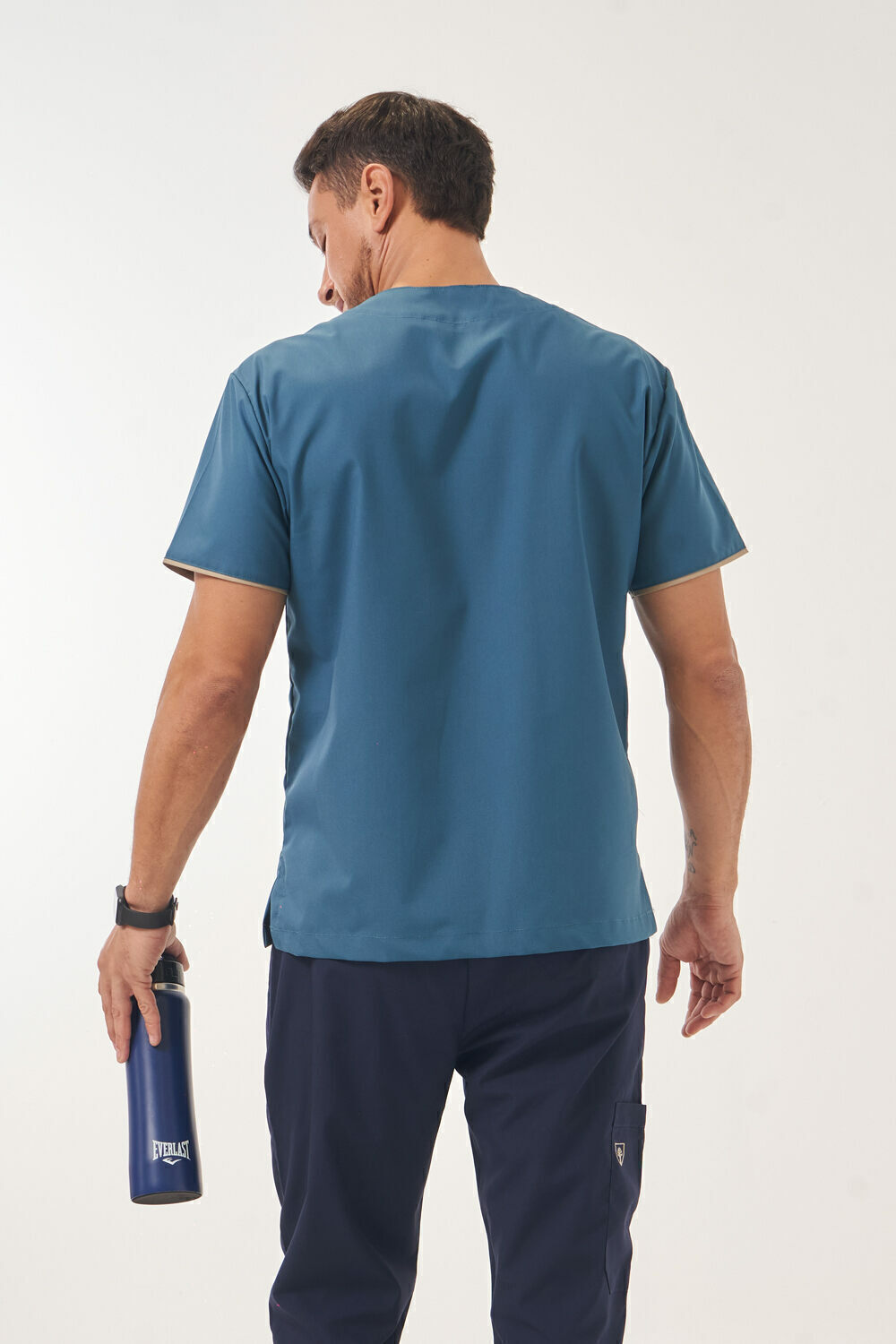 Cuello con tela de combinacion estampada y tela base en sobretono color azulino con presilla para colgar con estampado en combinación.