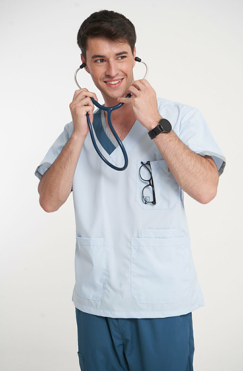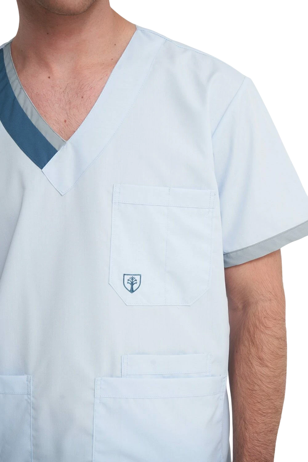 Cuello con tela de combinacion estampada y tela base en sobretono color azulino con presilla para colgar con estampado en combinación.