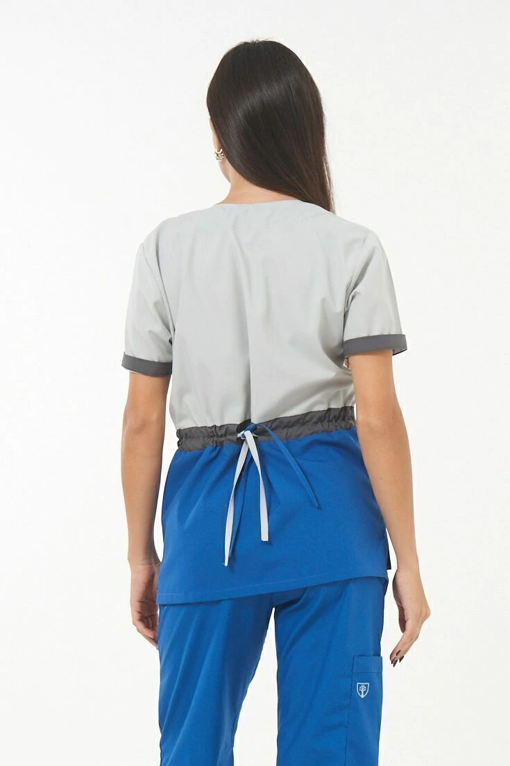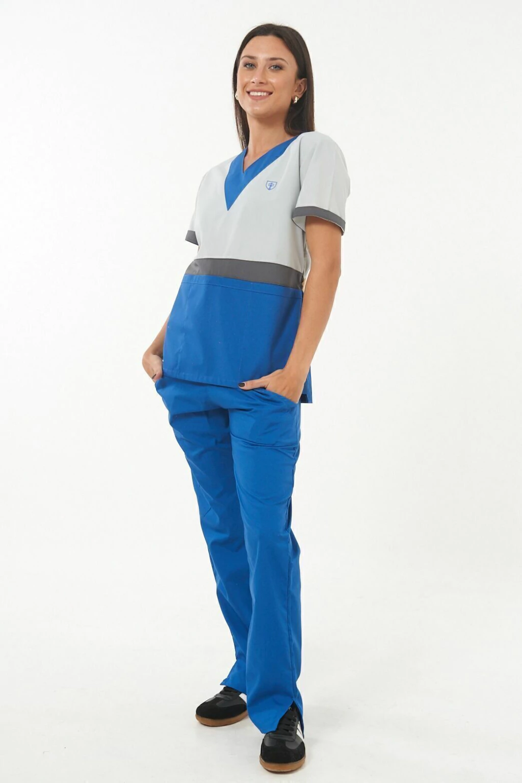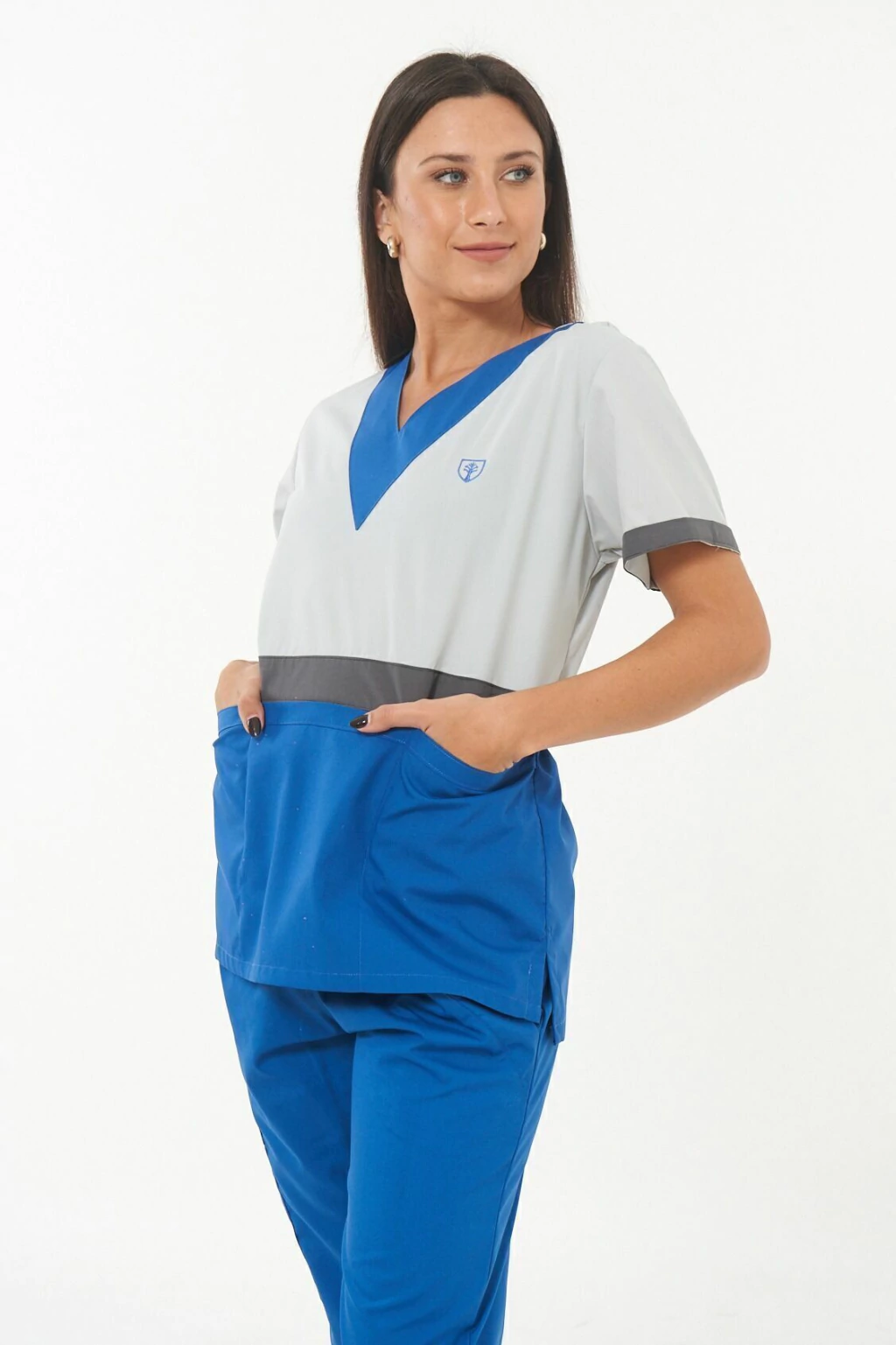 Bolsillo triple frontal ( tipo cheff ) muy amplios y comodos con abrojo en el bolsillo medio ideales para colocar libretas clinicas, estetoscopio o celulares.