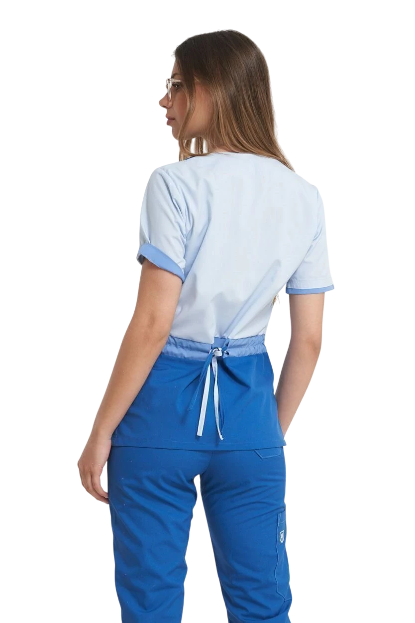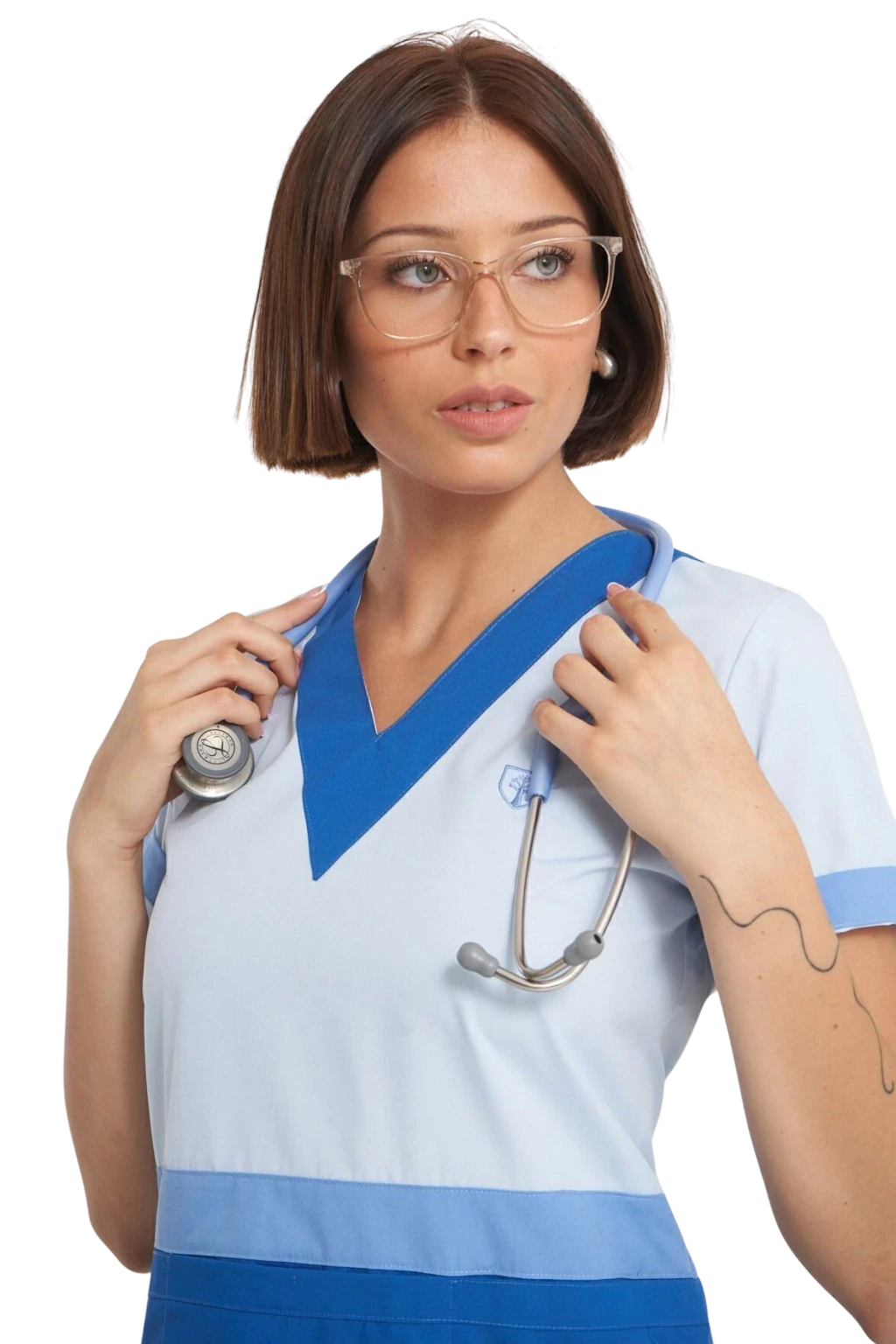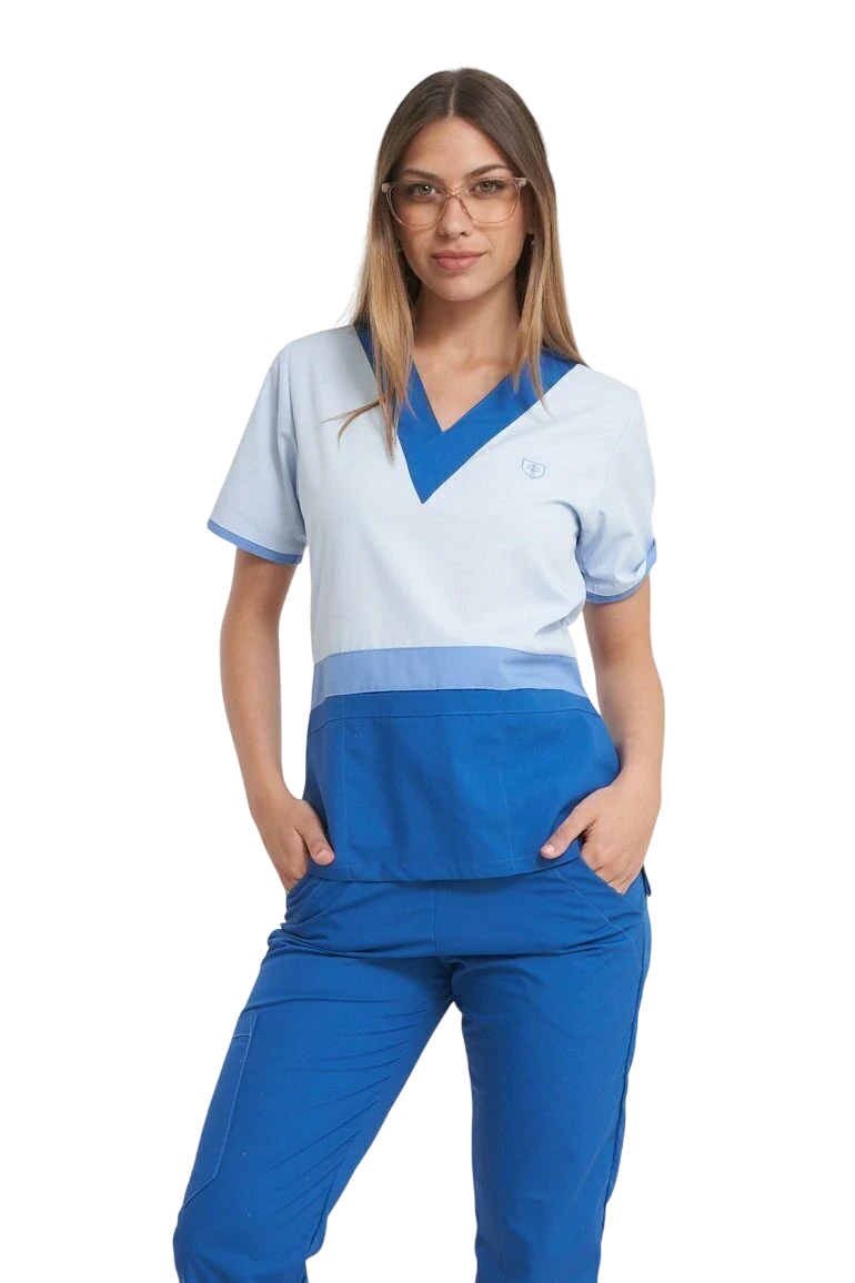 Bolsillo triple frontal ( tipo cheff ) muy amplios y comodos con abrojo en el bolsillo medio ideales para colocar libretas clinicas, estetoscopio o celulares.