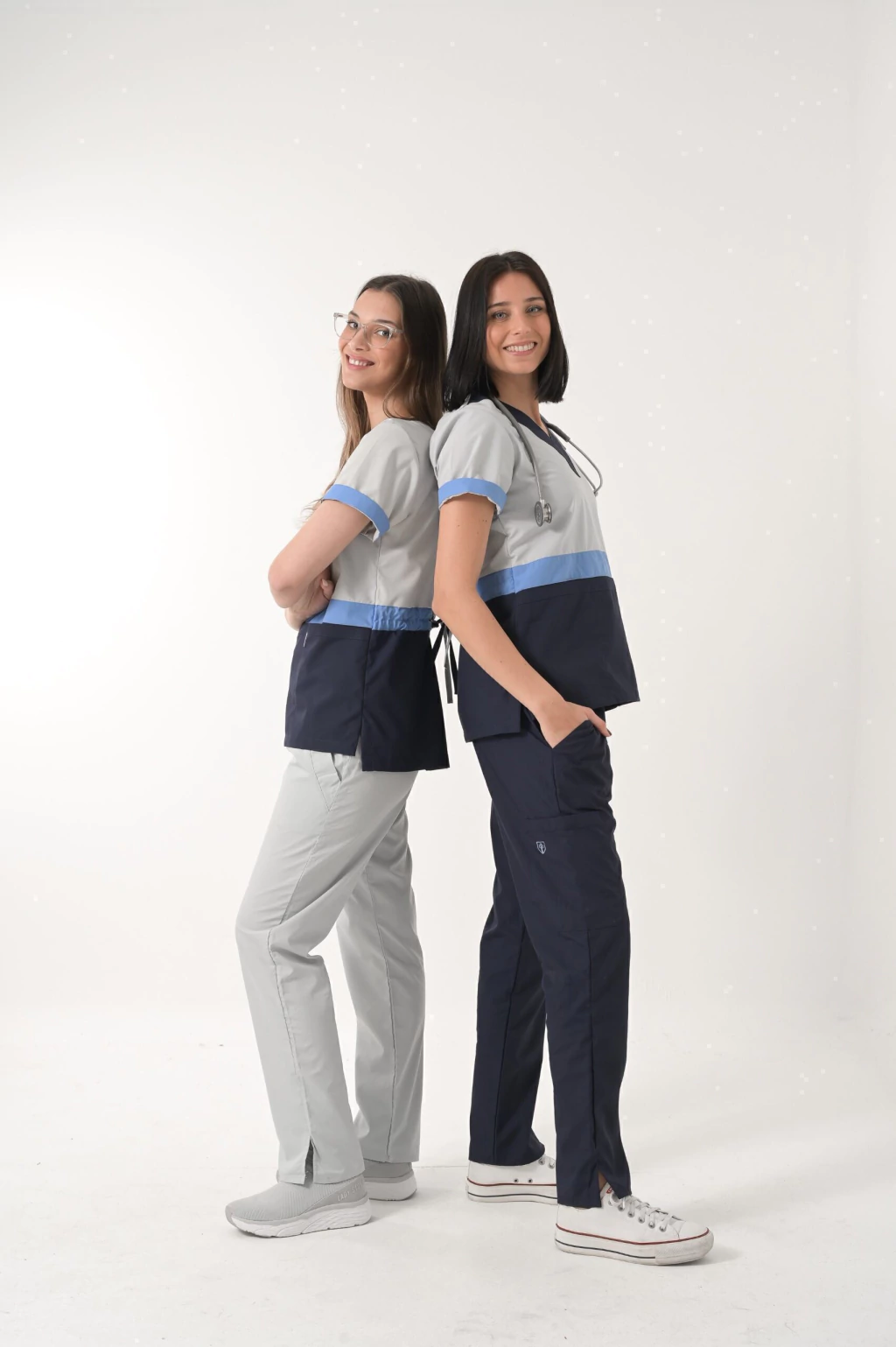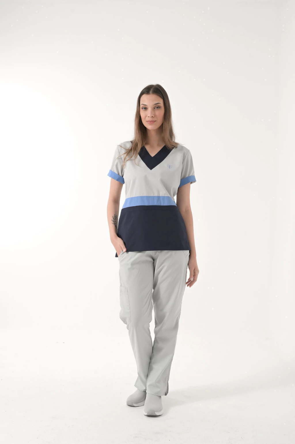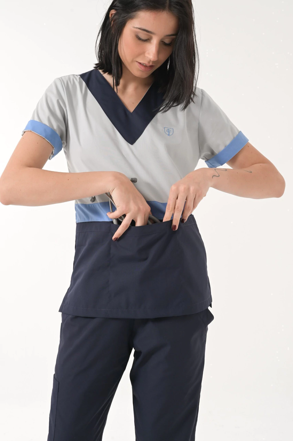 Bolsillo triple frontal ( tipo cheff ) muy amplios y comodos con abrojo en el bolsillo medio ideales para colocar libretas clinicas, estetoscopio o celulares.