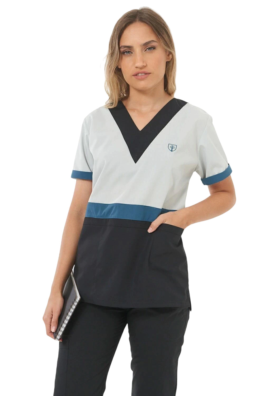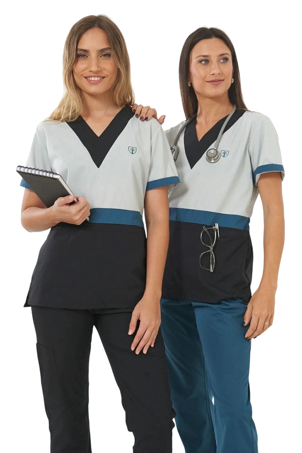 Bolsillo triple frontal ( tipo cheff ) muy amplios y comodos con abrojo en el bolsillo medio ideales para colocar libretas clinicas, estetoscopio o celulares.