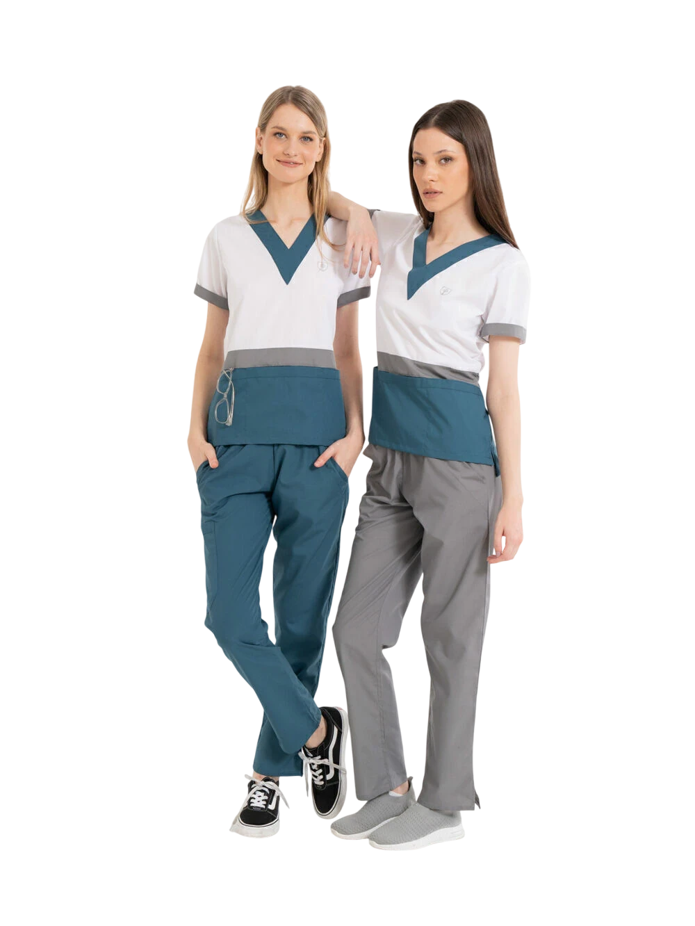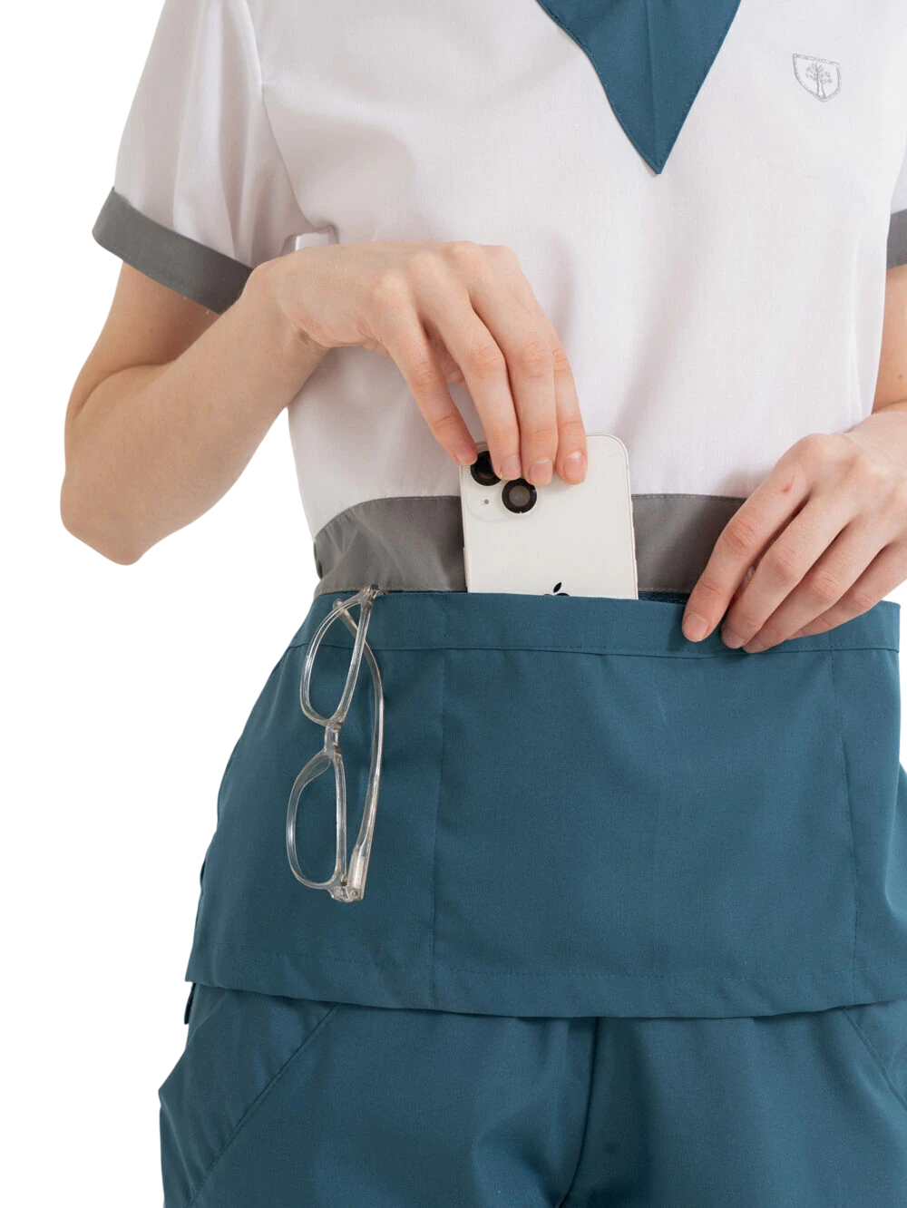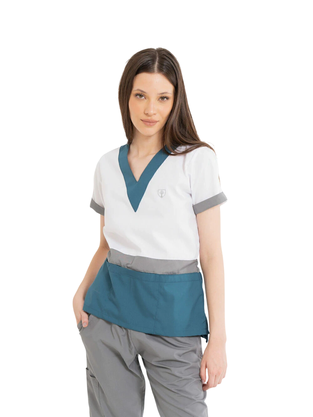 Bolsillo triple frontal ( tipo cheff ) muy amplios y comodos con abrojo en el bolsillo medio ideales para colocar libretas clinicas, estetoscopio o celulares.