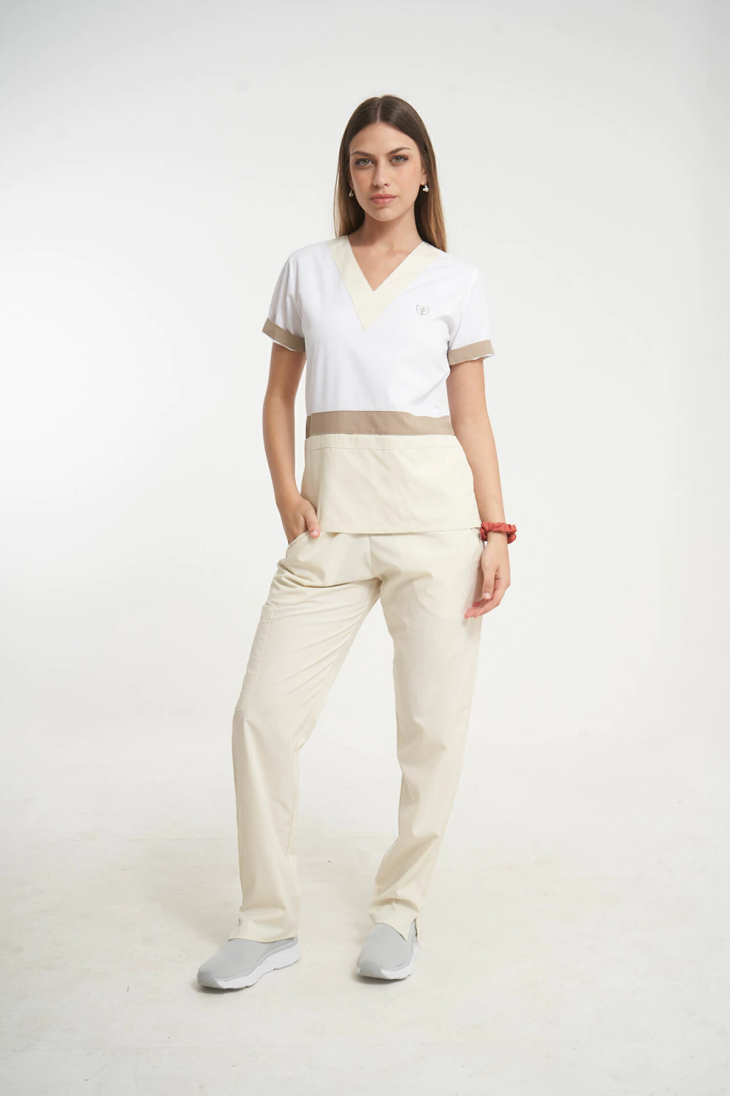 Bolsillo triple frontal ( tipo cheff ) muy amplios y comodos con abrojo en el bolsillo medio ideales para colocar libretas clinicas, estetoscopio o celulares.