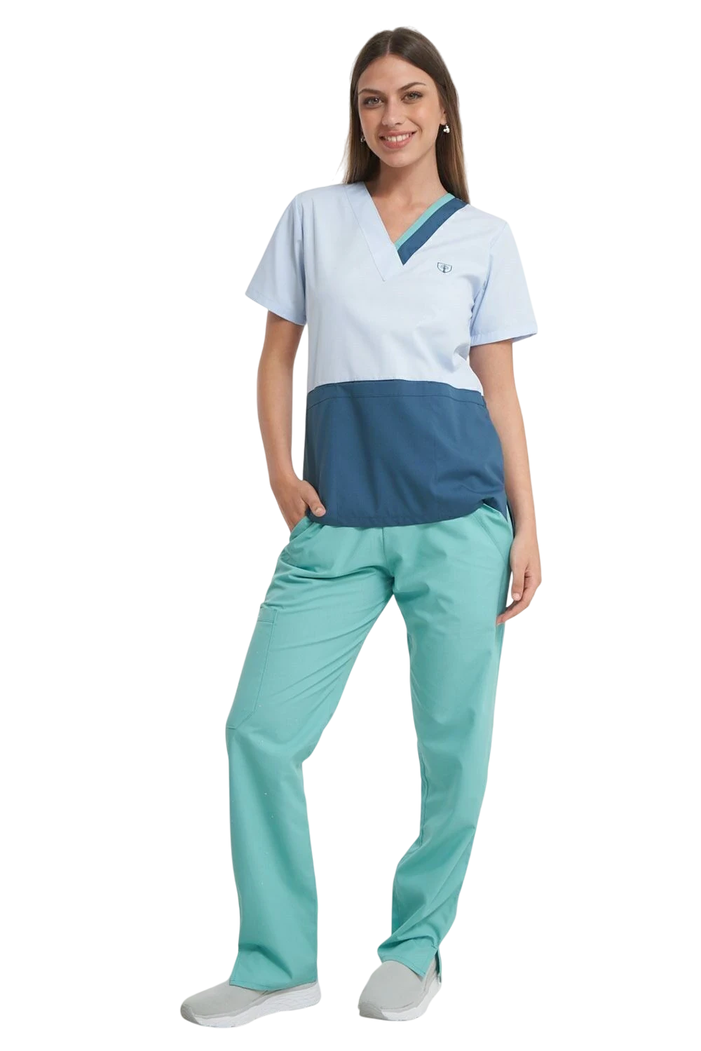 Bolsillo triple ( tipo cheff ) muy amplios y comodos con abrojo en el bolsillo medio ideales para colocar libretas clinicas, estetoscopio o celulares.